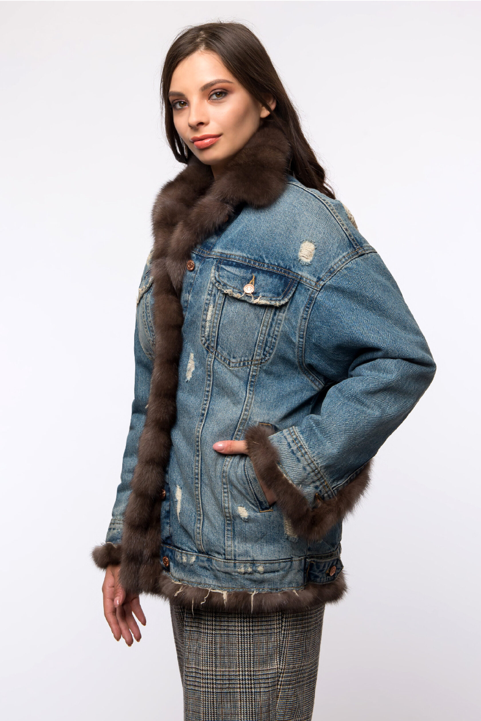 Джинсовая куртка свободного покроя, воротник, подборта, низ куртки и манжеты из меха рыси. Подкладка утепленая из натурального хлопка с рисунком.