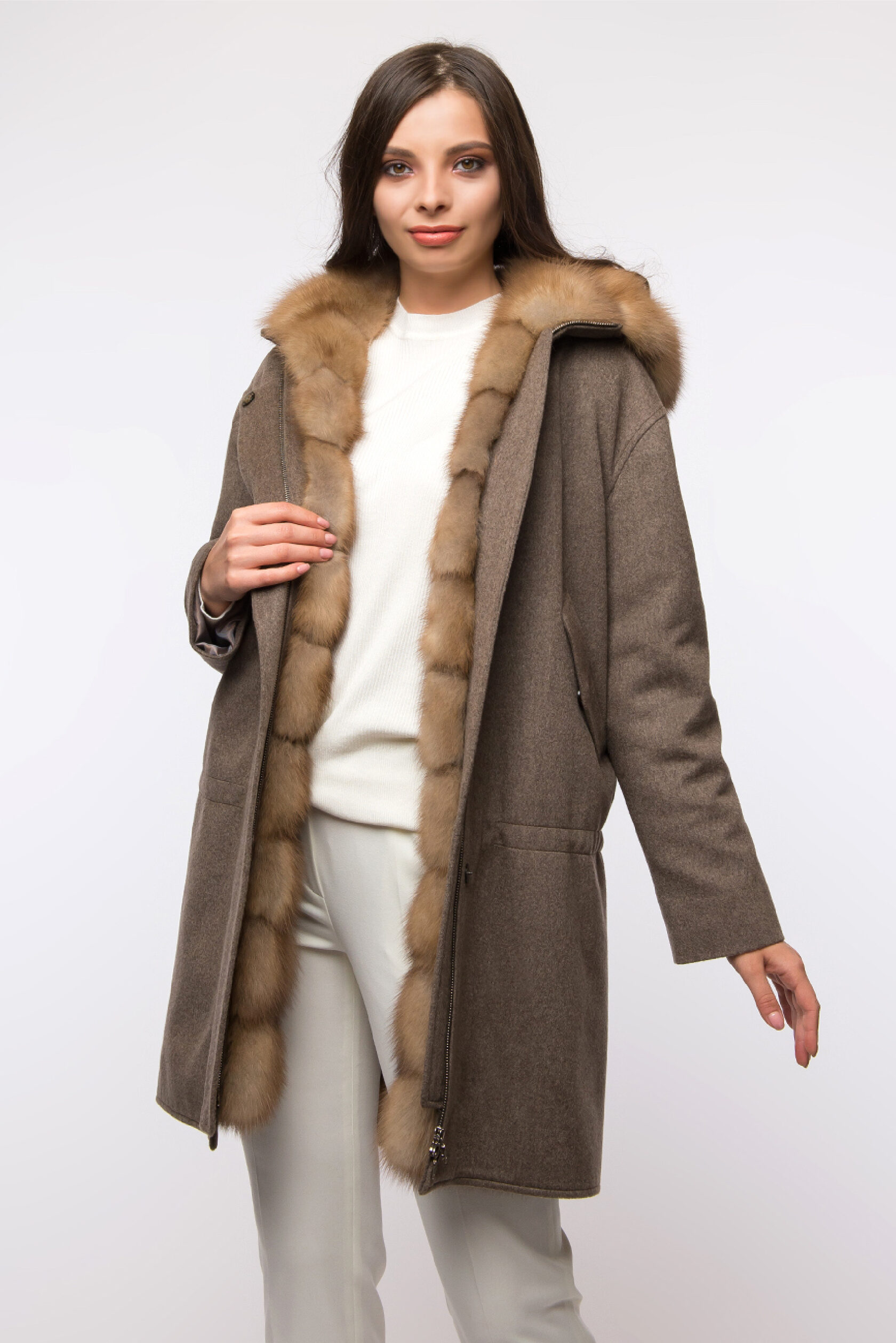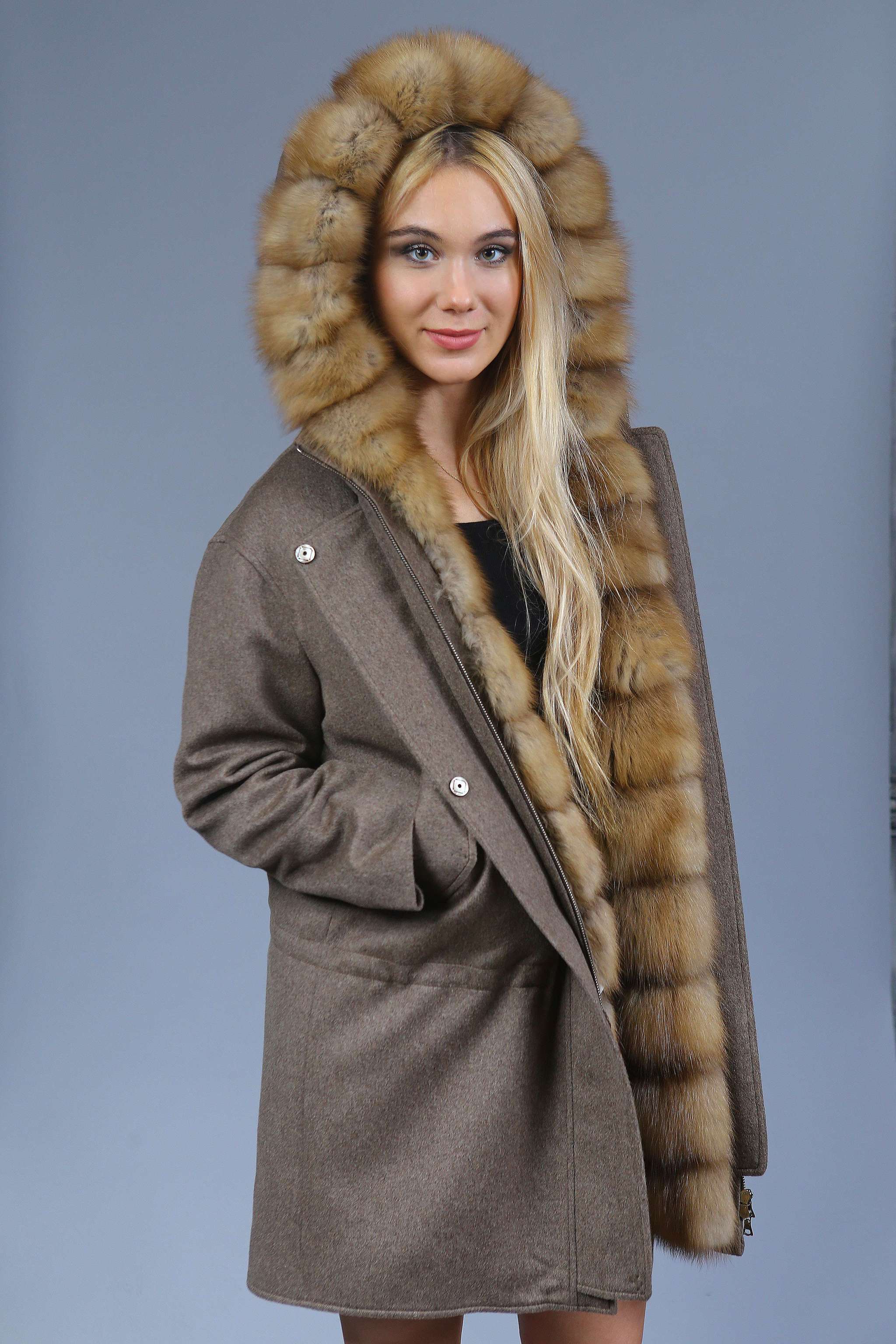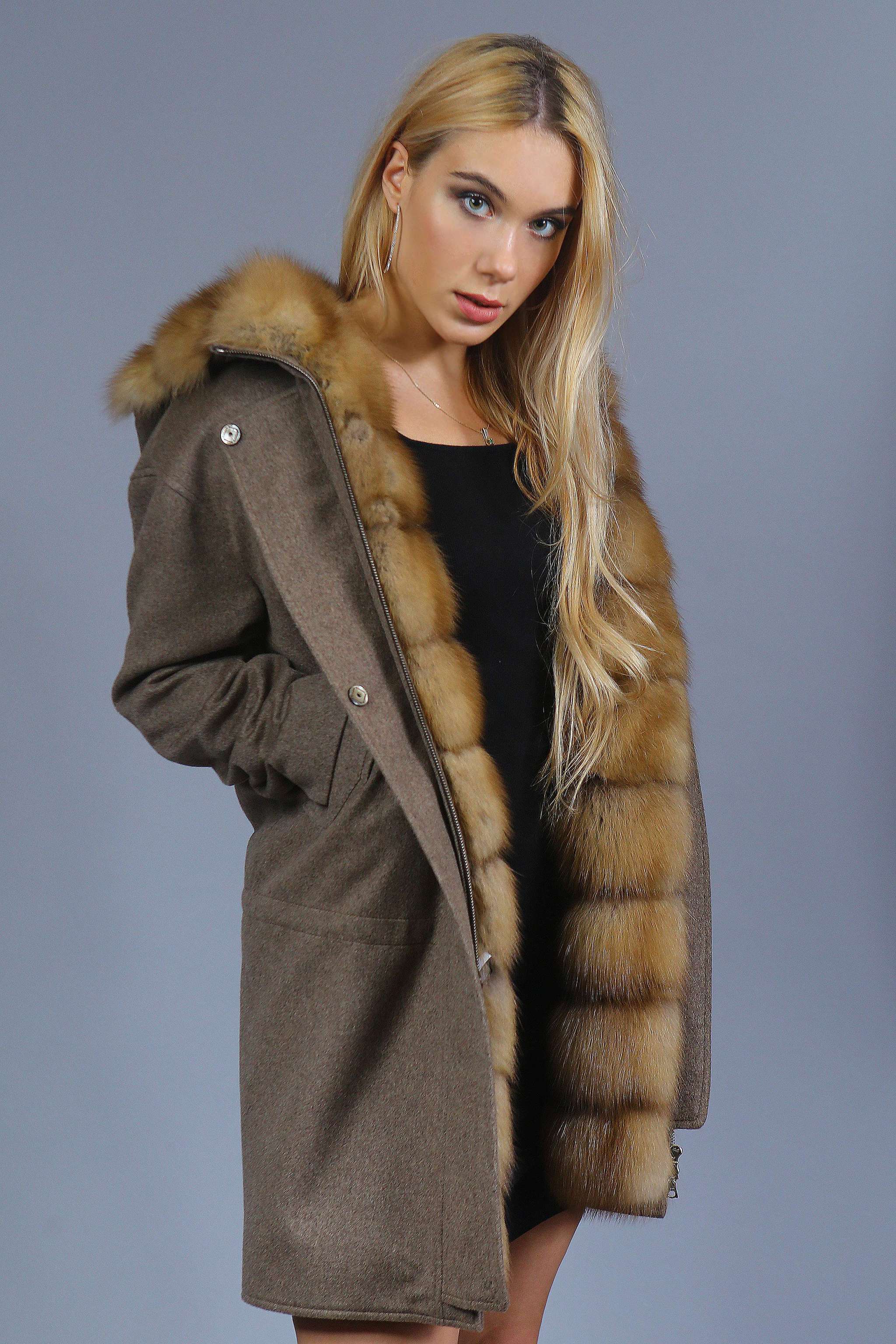 Парка выполнена из высококачественного итальянского кашемира, на молнии, кулиса чуть ниже талии. Карманы с клапаном, капюшон.